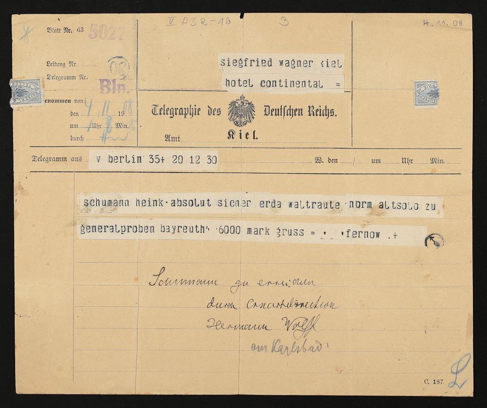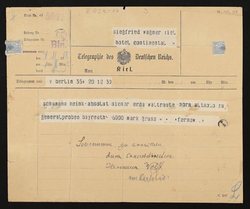 Telegramm von Ernestine Schumann-Heink an Siegfried Wagner