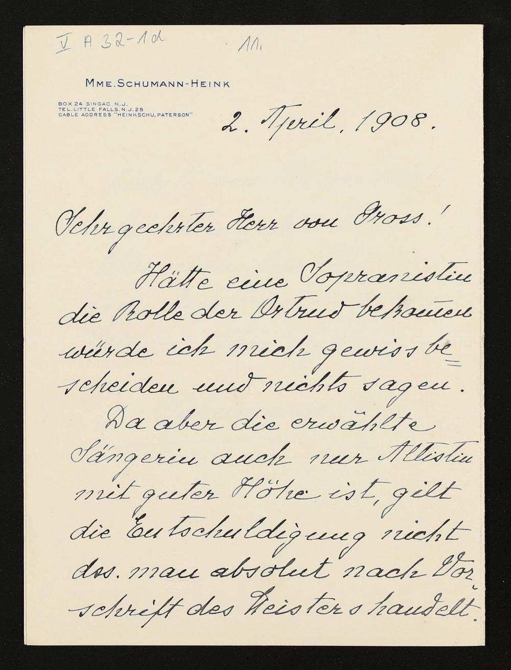 eigenhändiger Brief von Ernestine Schumann-Heink an Adolf von Gross