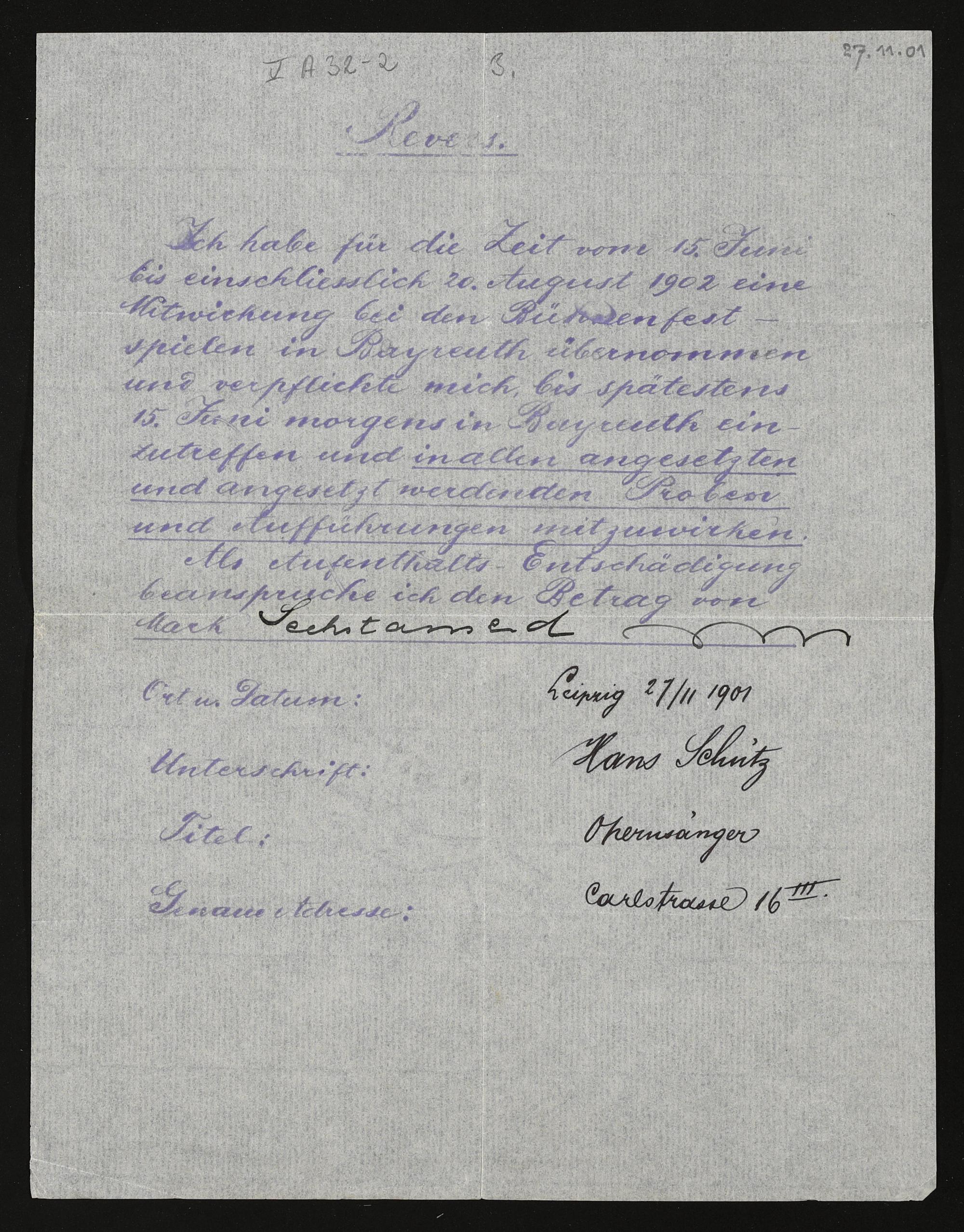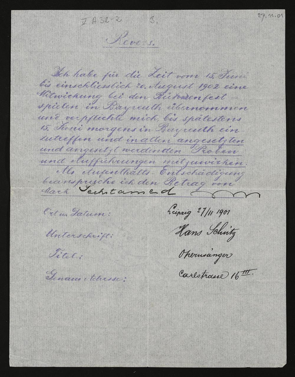 Revers mit eigenhändigen Eintragungen von Hans Schütz an die Verwaltung der Bühnenfestspiele