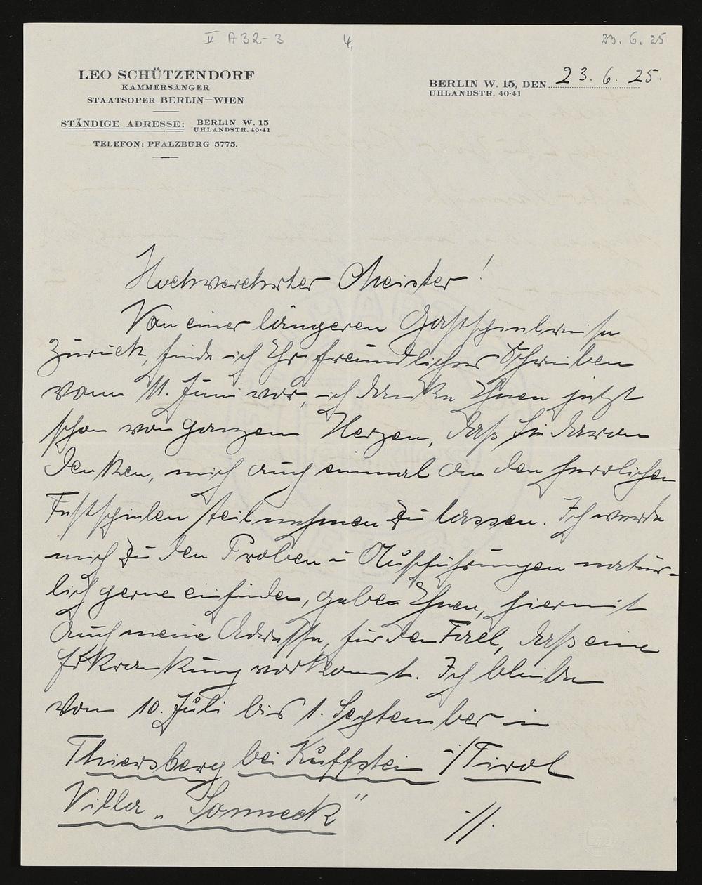 eigenhändiger Brief von Leo Schützendorf an Siegfried Wagner