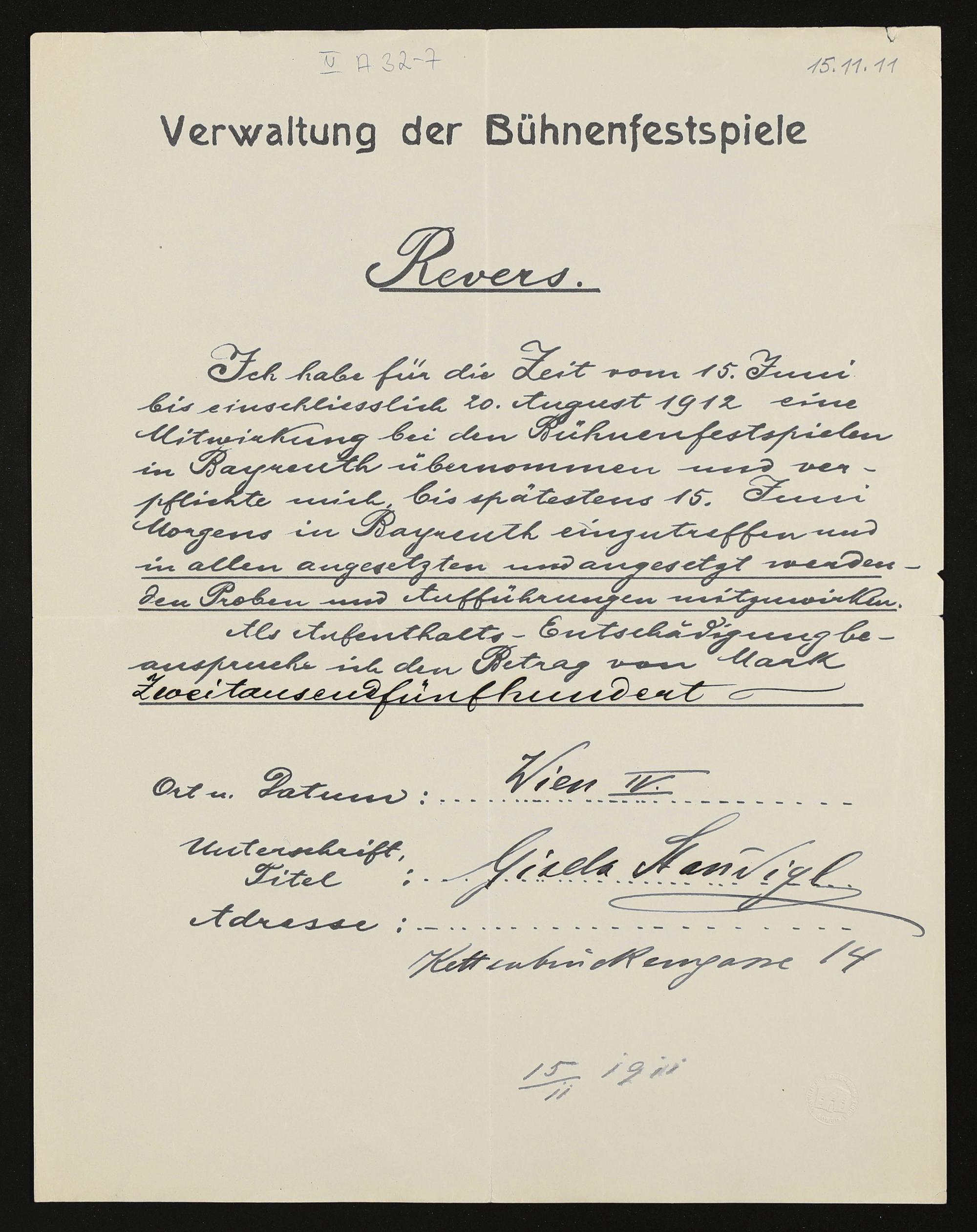 Revers mit eigenhändigen Eintragungen von Gisela Staudigl an die Verwaltung der Bühnenfestspiele