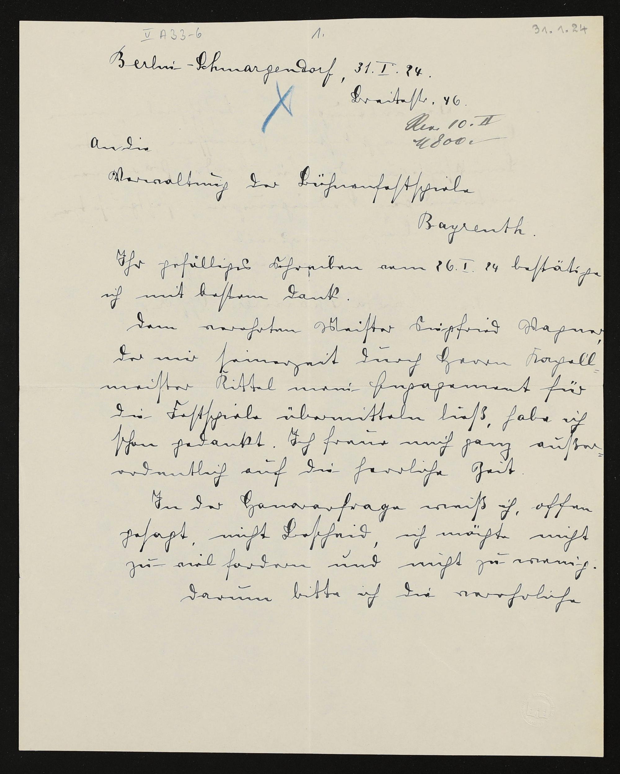 eigenhändiger Brief von Marta Thanner-Offer an die Verwaltung der Bühnenfestspiele