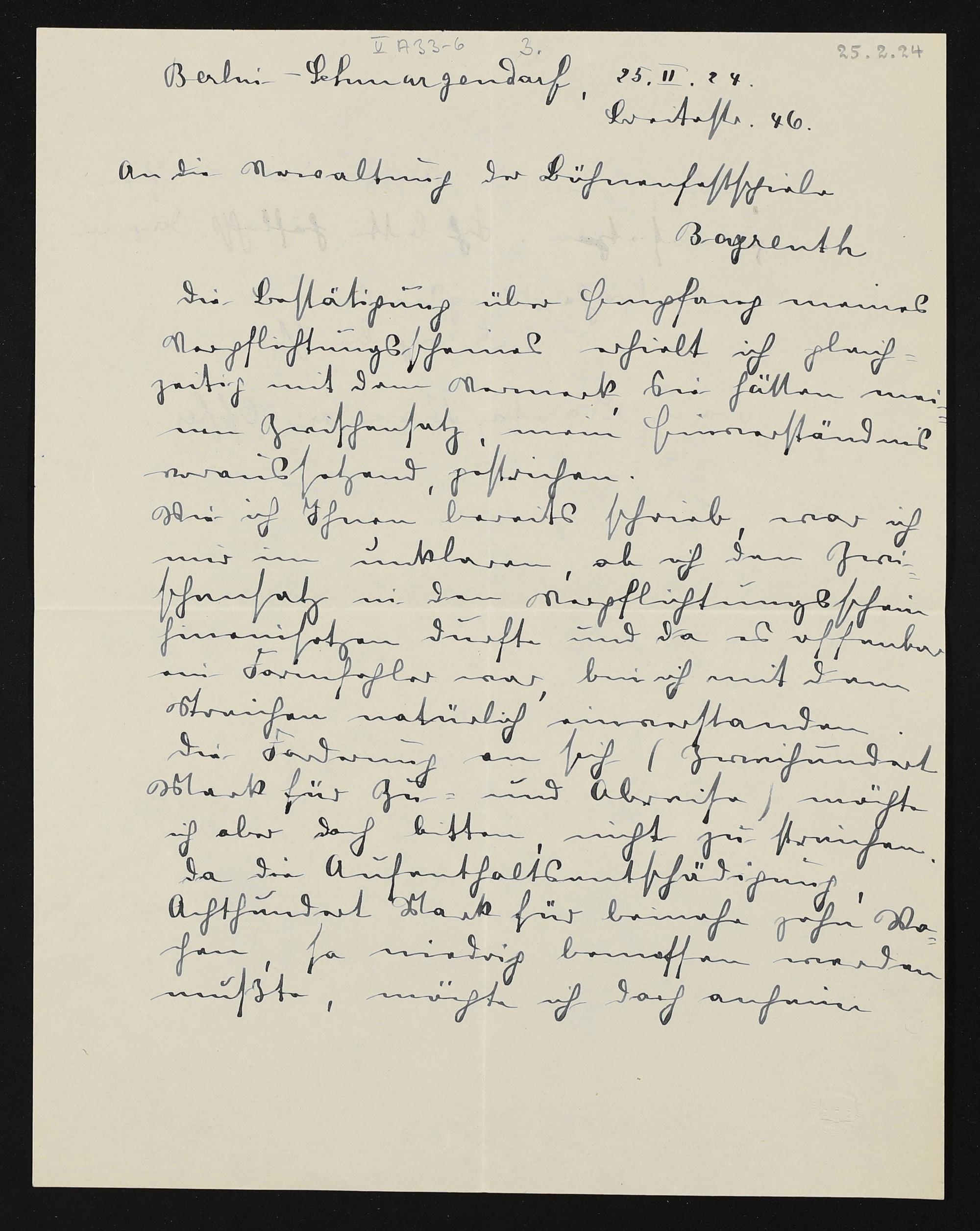 eigenhändiger Brief von Marta Thanner-Offer an die Verwaltung der Bühnenfestspiele