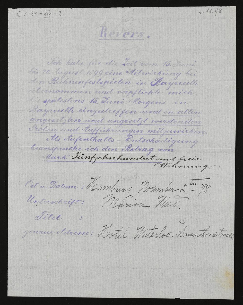 Revers mit eigenhändigen Eintragungen von Marion Weed an die Verwaltung der Bühnenfestspiele