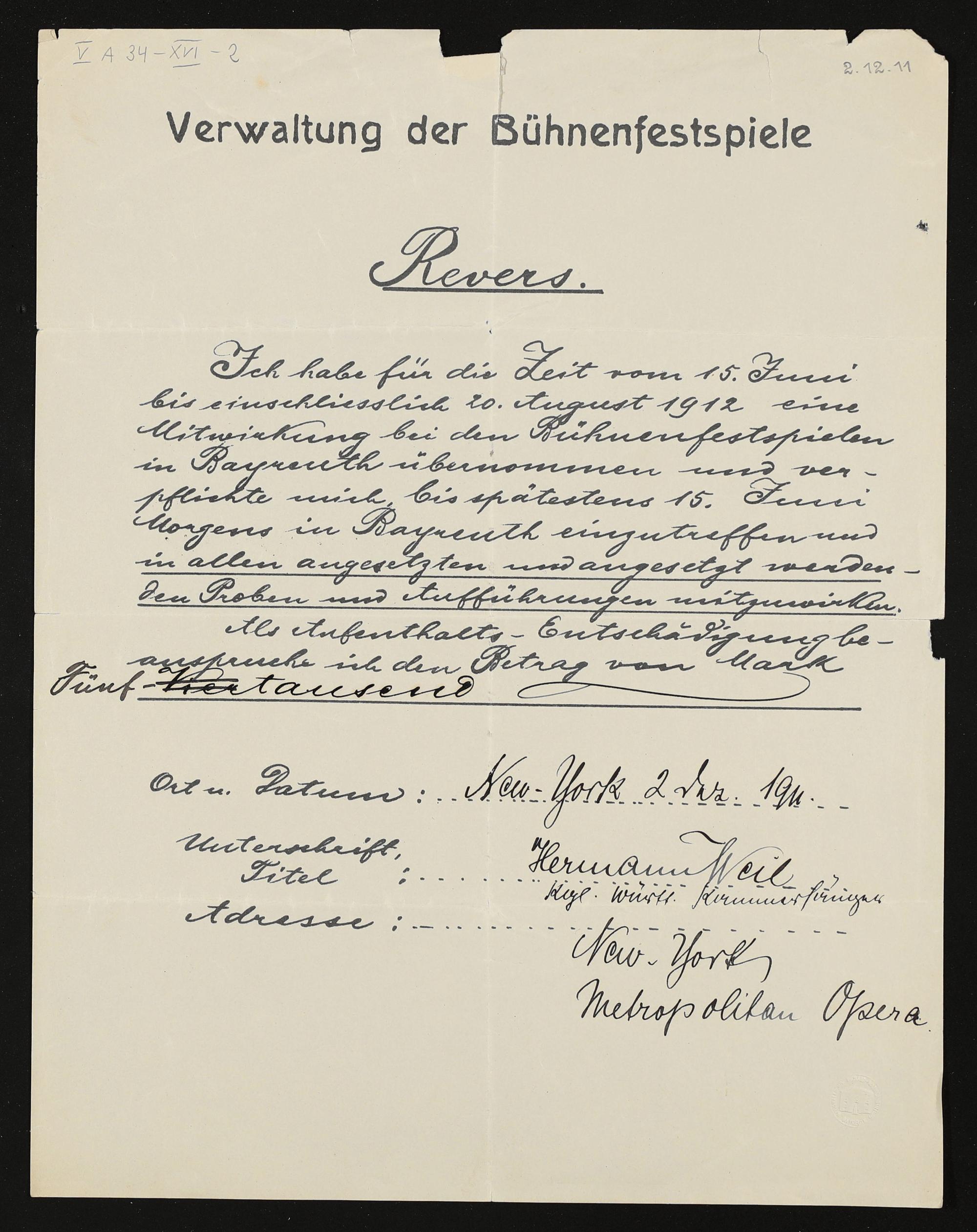 Revers mit eigenhändigen Eintragungen von Hermann Weil an die Verwaltung der Bühnenfestspiele