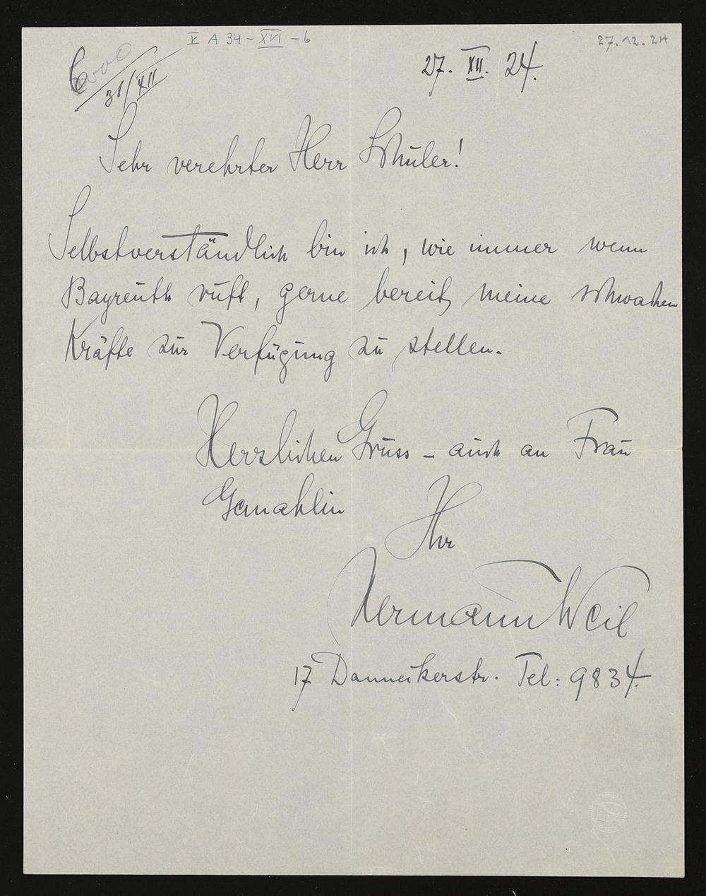 eigenhändiger Brief von Hermann Weil an Friedrich Wilhelm Schuler