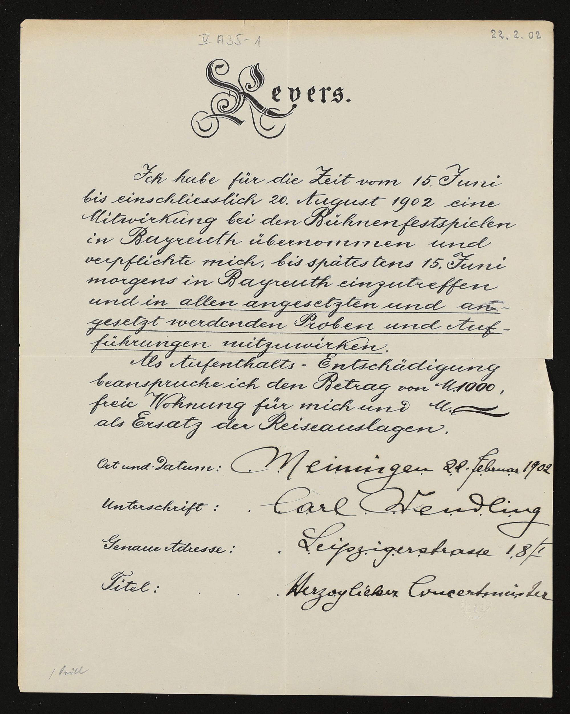Revers mit eigenhändigen Eintragungen von Carl Wendling an die Verwaltung der Bühnenfestspiele