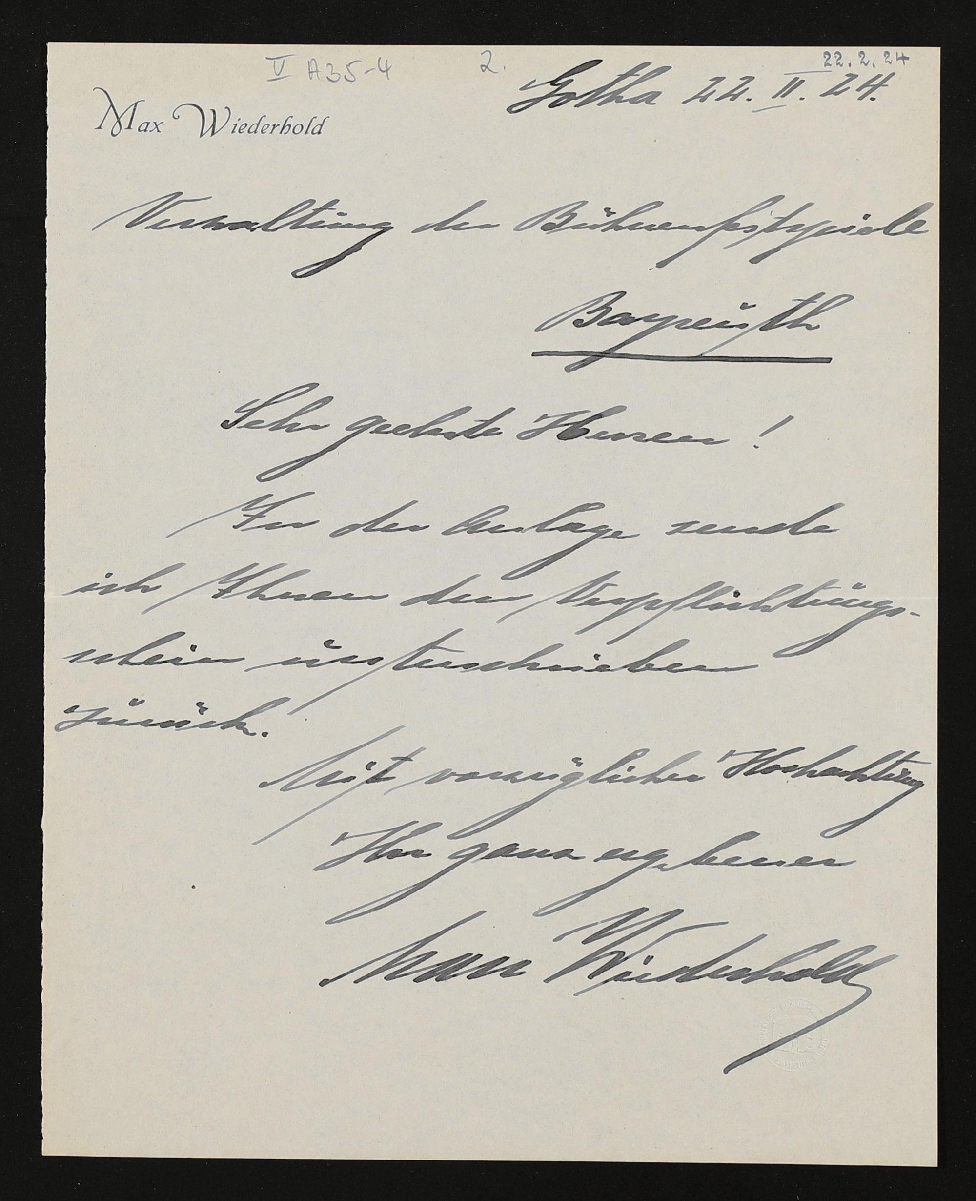 eigenhändiger Brief von Max Wiederhold an die Verwaltung der Bühnenfestspiele