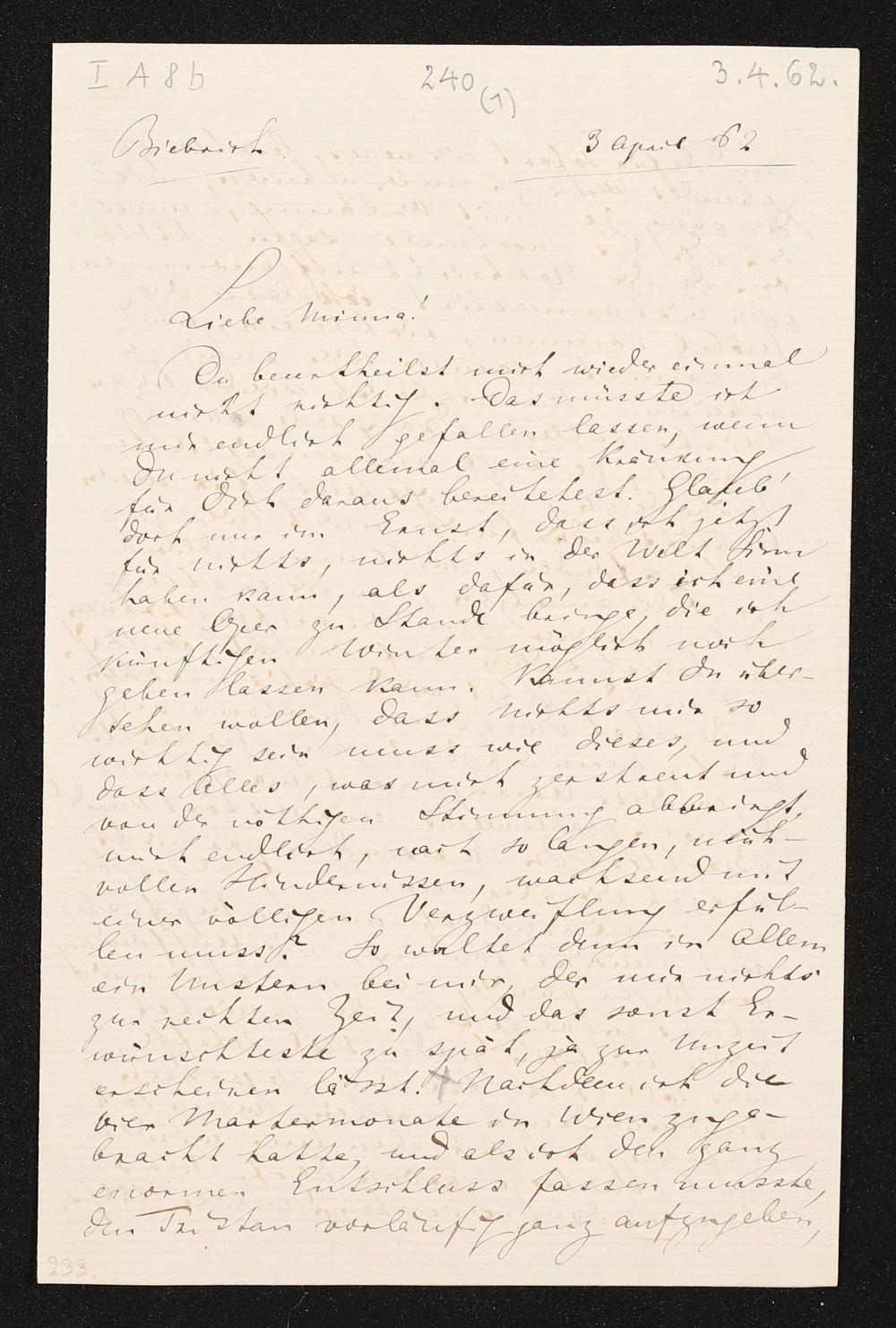 eigenhändiger Brief von Richard Wagner an Minna Wagner
