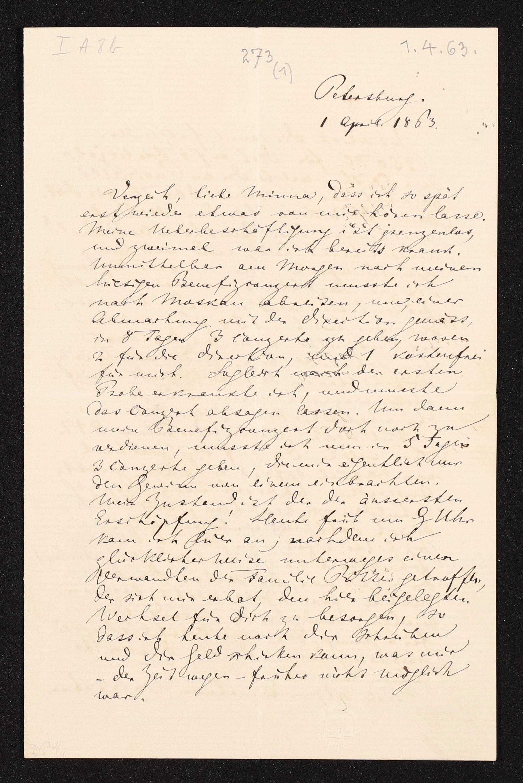 eigenhändiger Brief von Richard Wagner an Minna Wagner