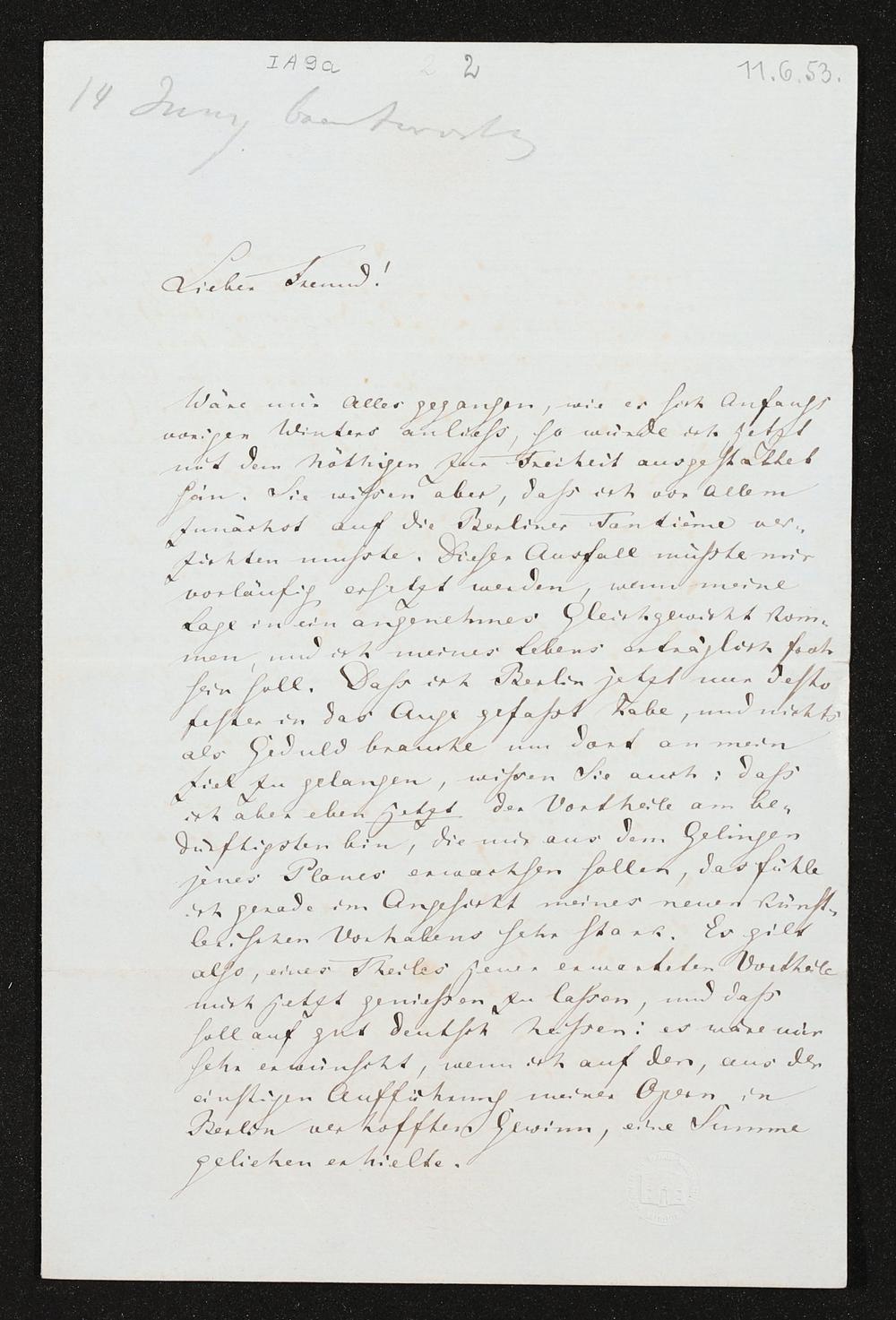 eigenhändiger Brief von Richard Wagner an Otto Wesendonck