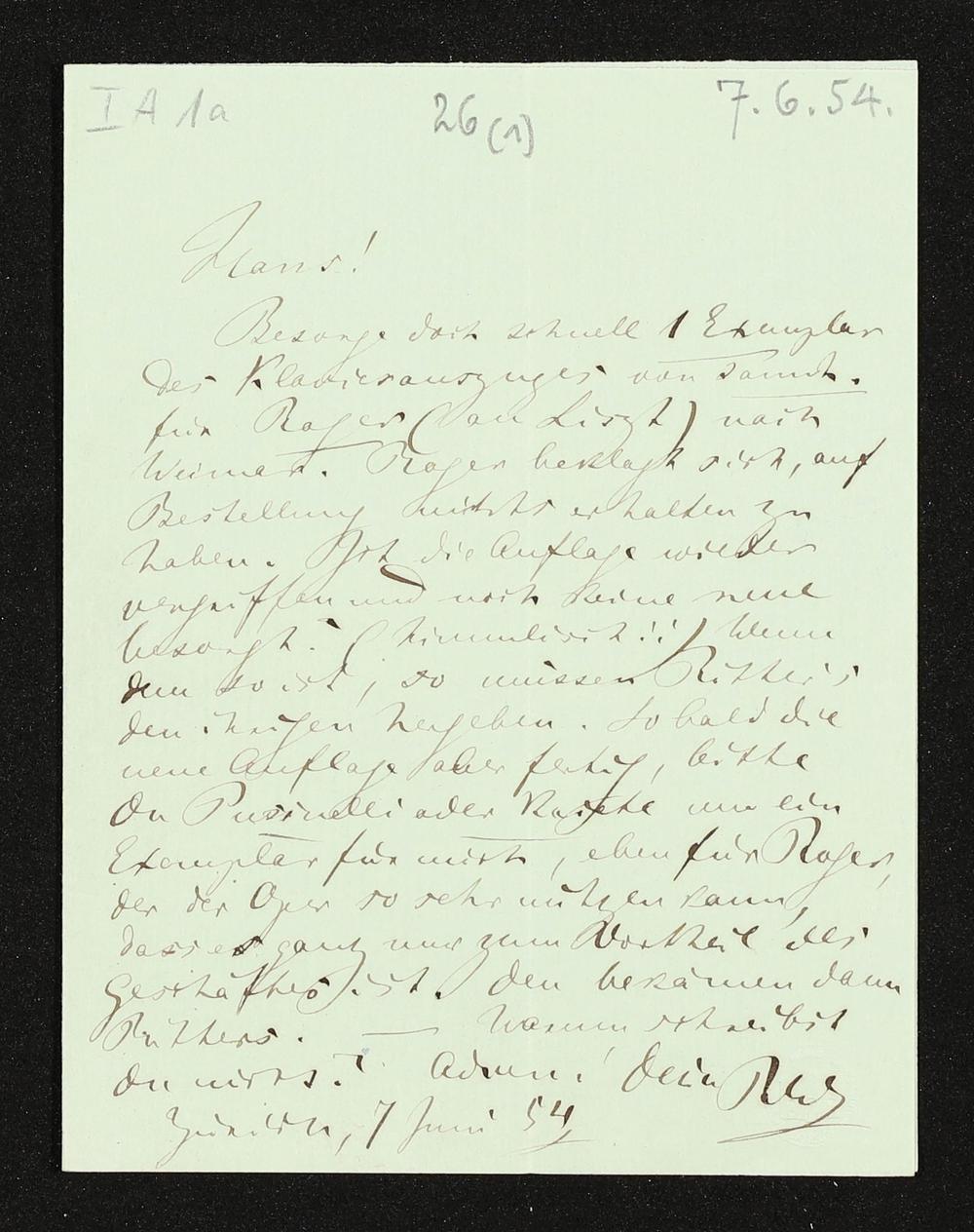eigenhändiger Brief von Richard Wagner an Hans von Bülow