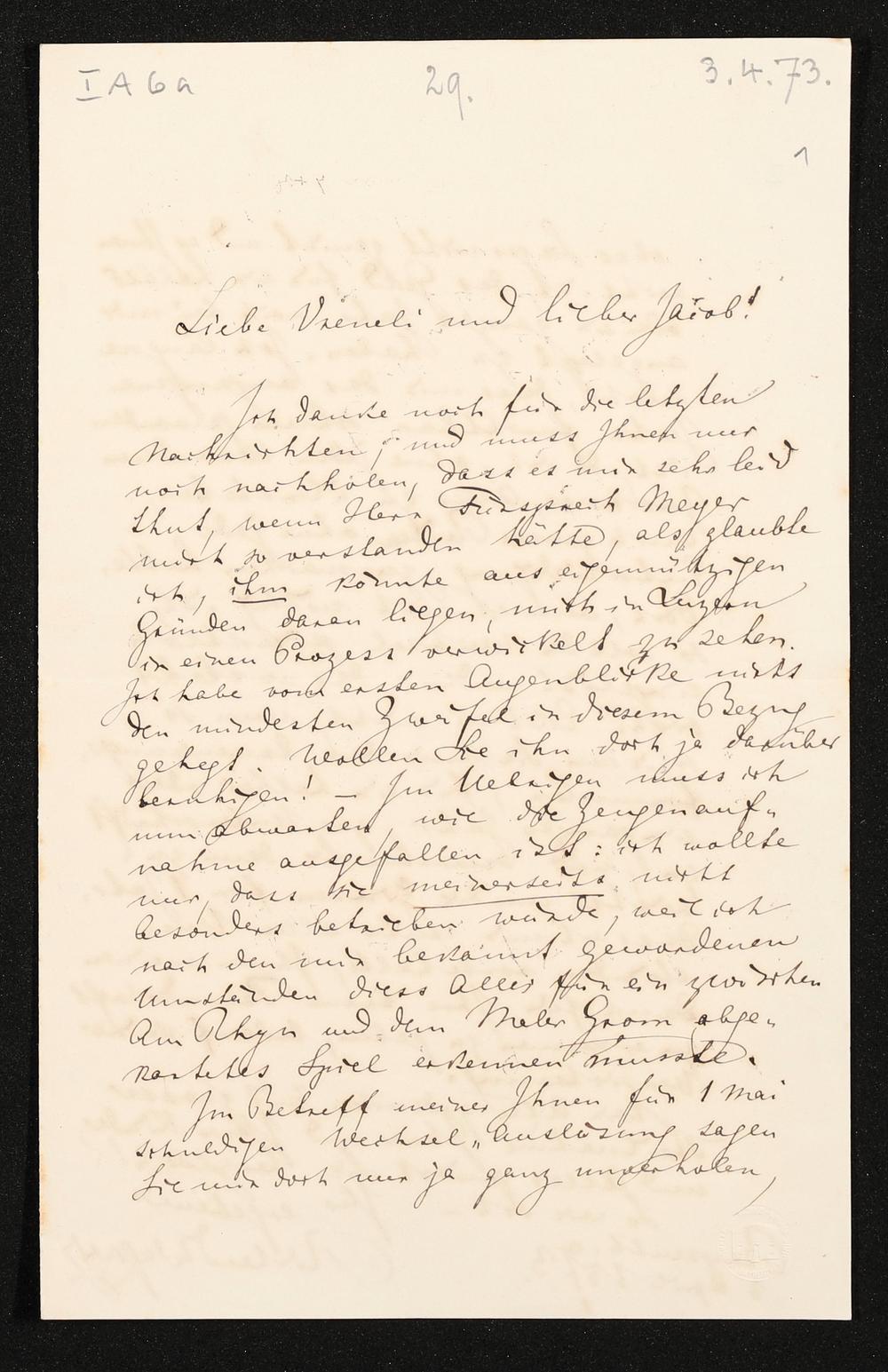 eigenhändiger Brief von Richard Wagner an Verena Stocker und Jacob Stocker