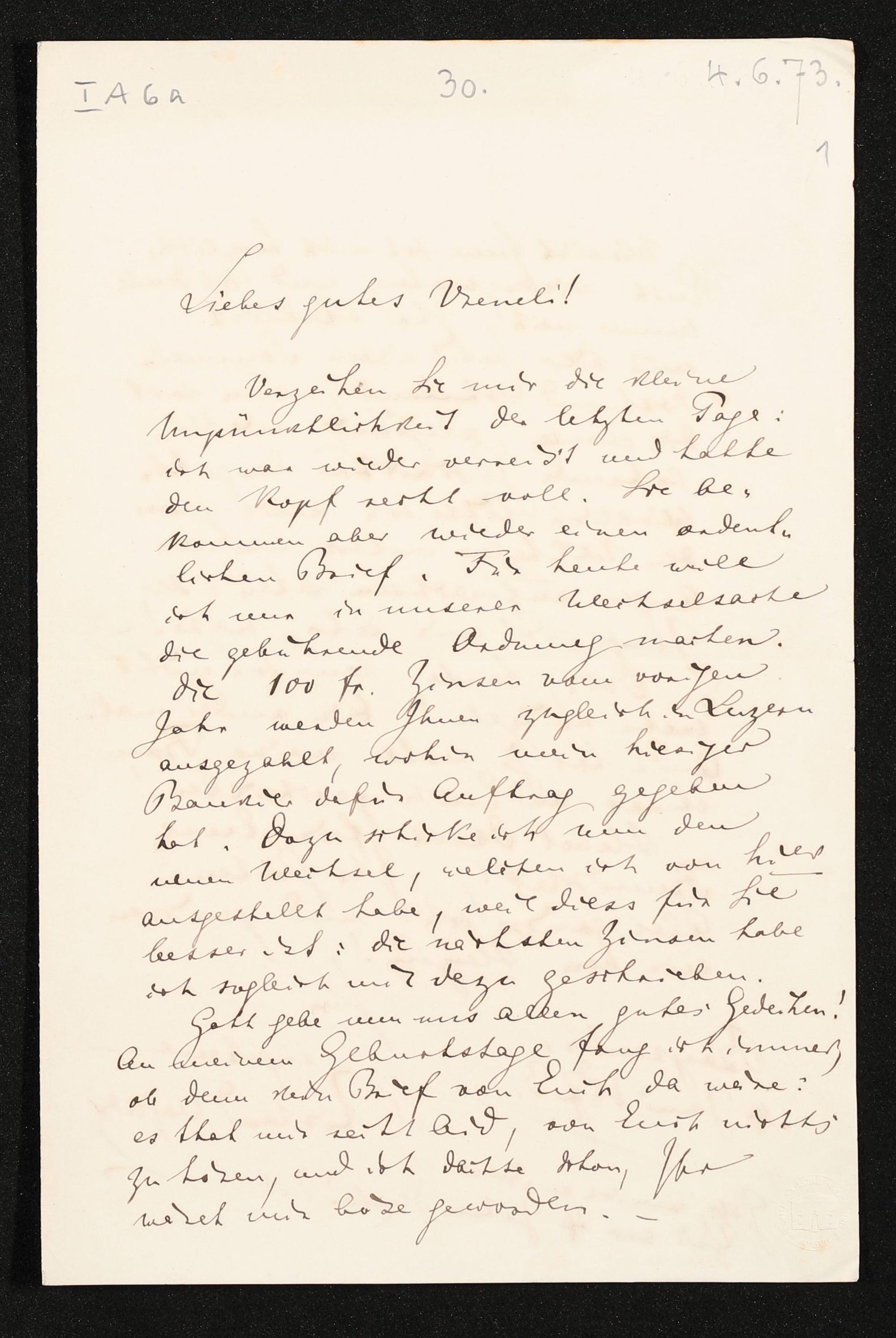 eigenhändiger Brief von Richard Wagner an Verena Stocker