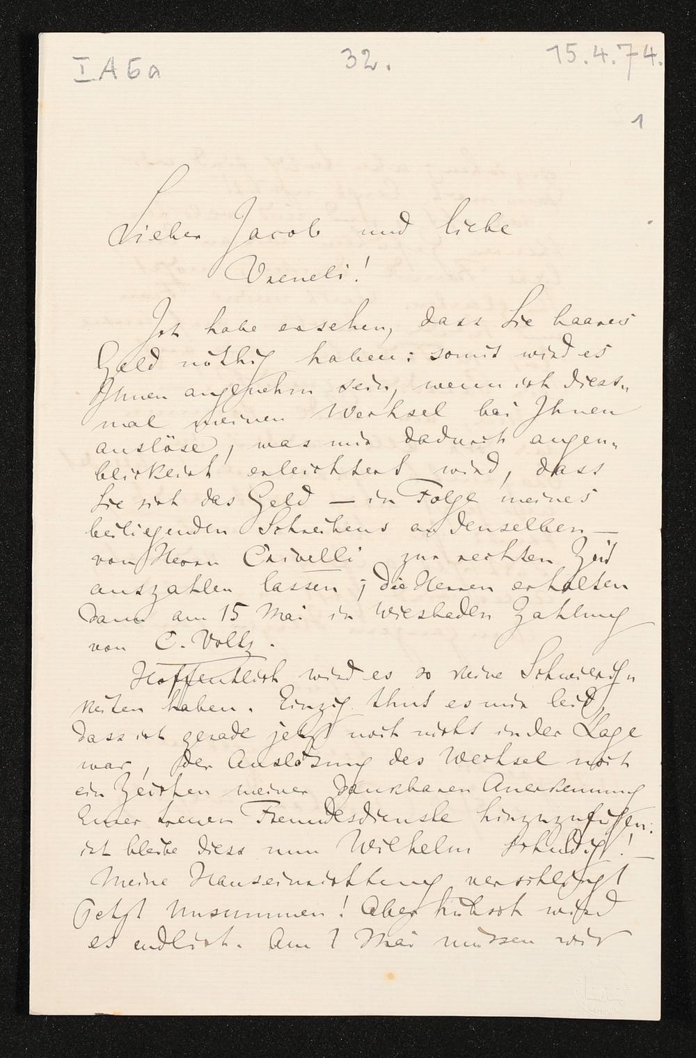 eigenhändiger Brief von Richard Wagner an Verena Stocker und Jacob Stocker