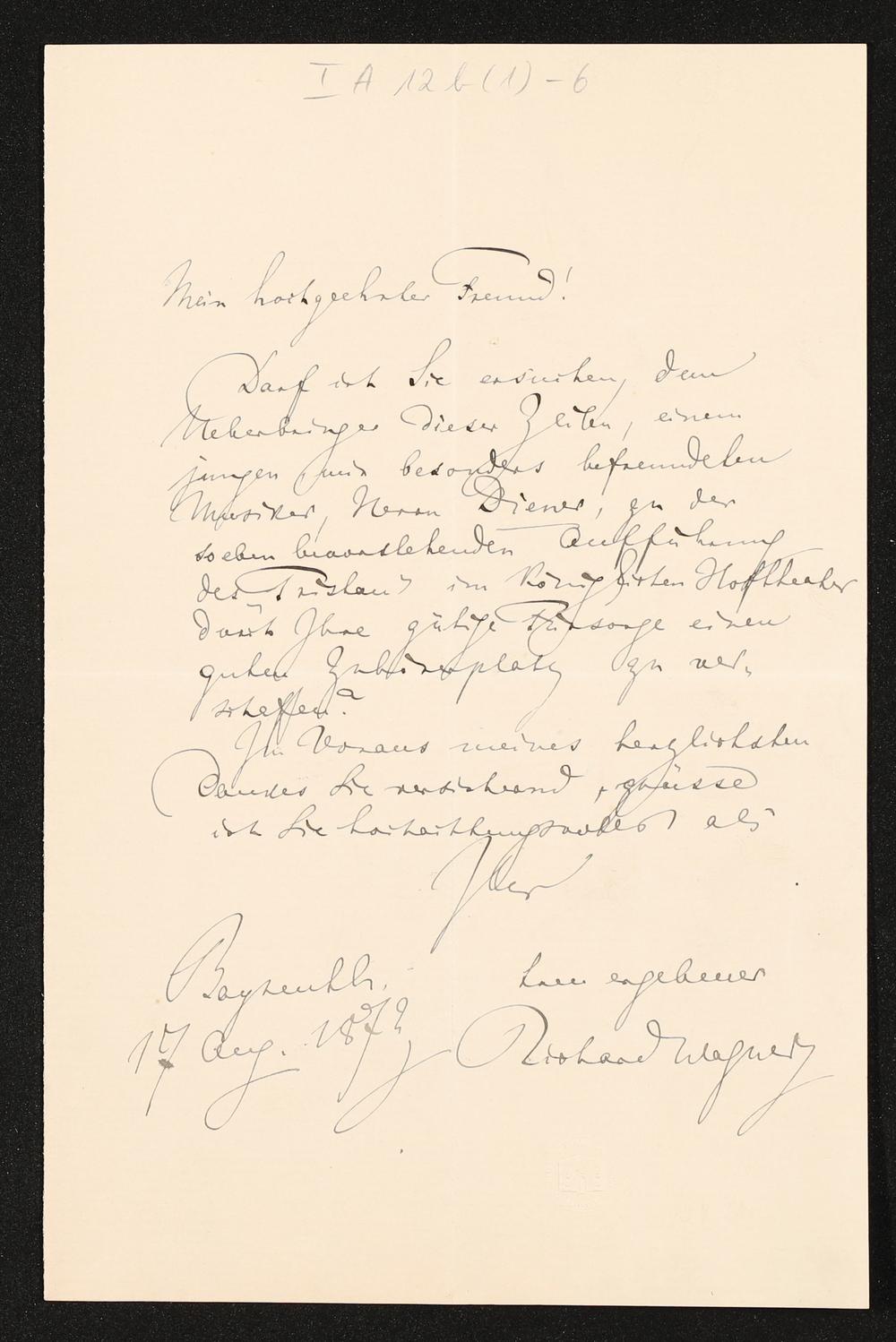 eigenhändiger Brief von Richard Wagner an Lorenz von Düfflipp