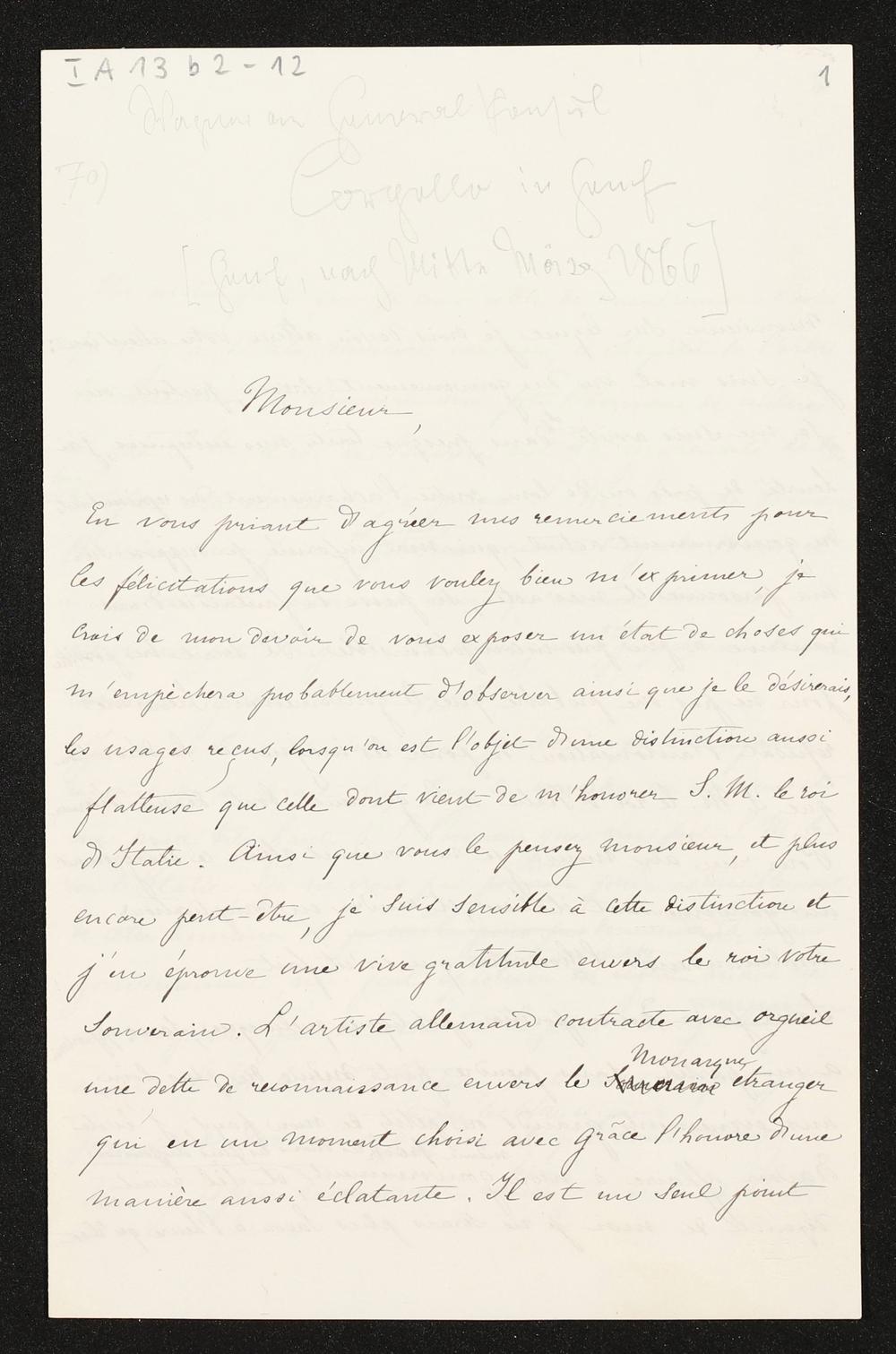 eigenhändiges Briefkonzept von Richard Wagner an Giovanni Capello