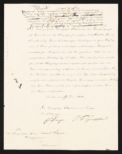 eigenhändiger Brief von Fr. Dange und O. F. Gruppe (Königliche Akademie der Künste Berlin) an Richard Wagner, eigenhändiger Brief von Richard Wagner an die Königliche Akademie der Künste Berlin