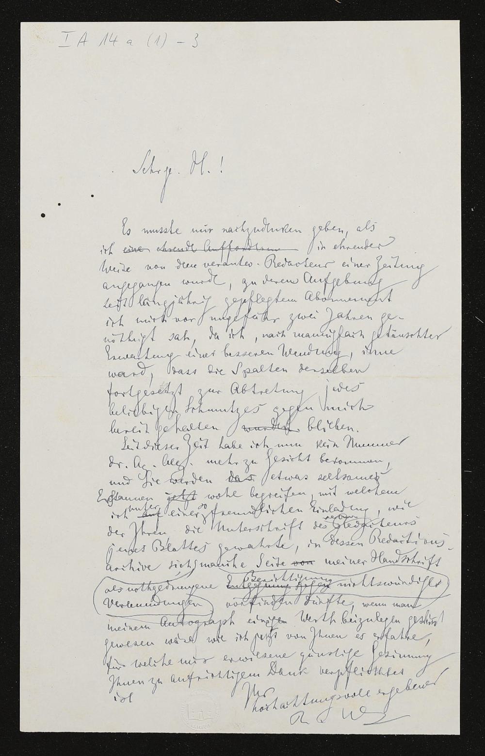 eigenhändiges Briefkonzept von Richard Wagner an Karl von Gerstenberg
