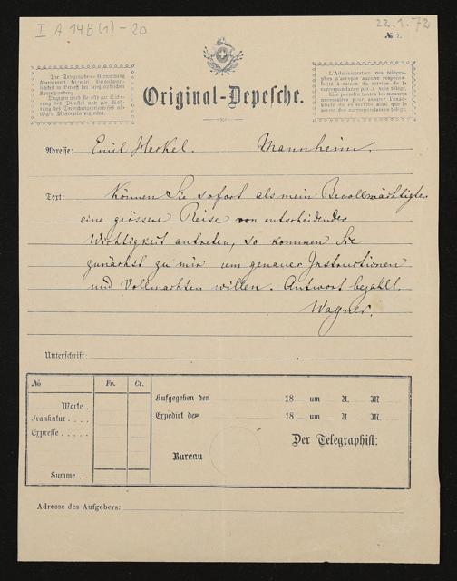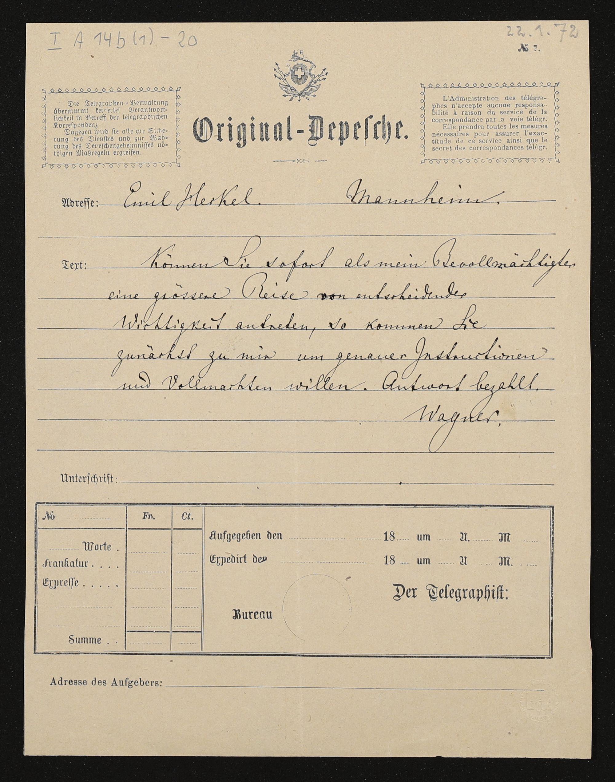 Telegrammkonzept von Richard Wagner an Emil Heckel
