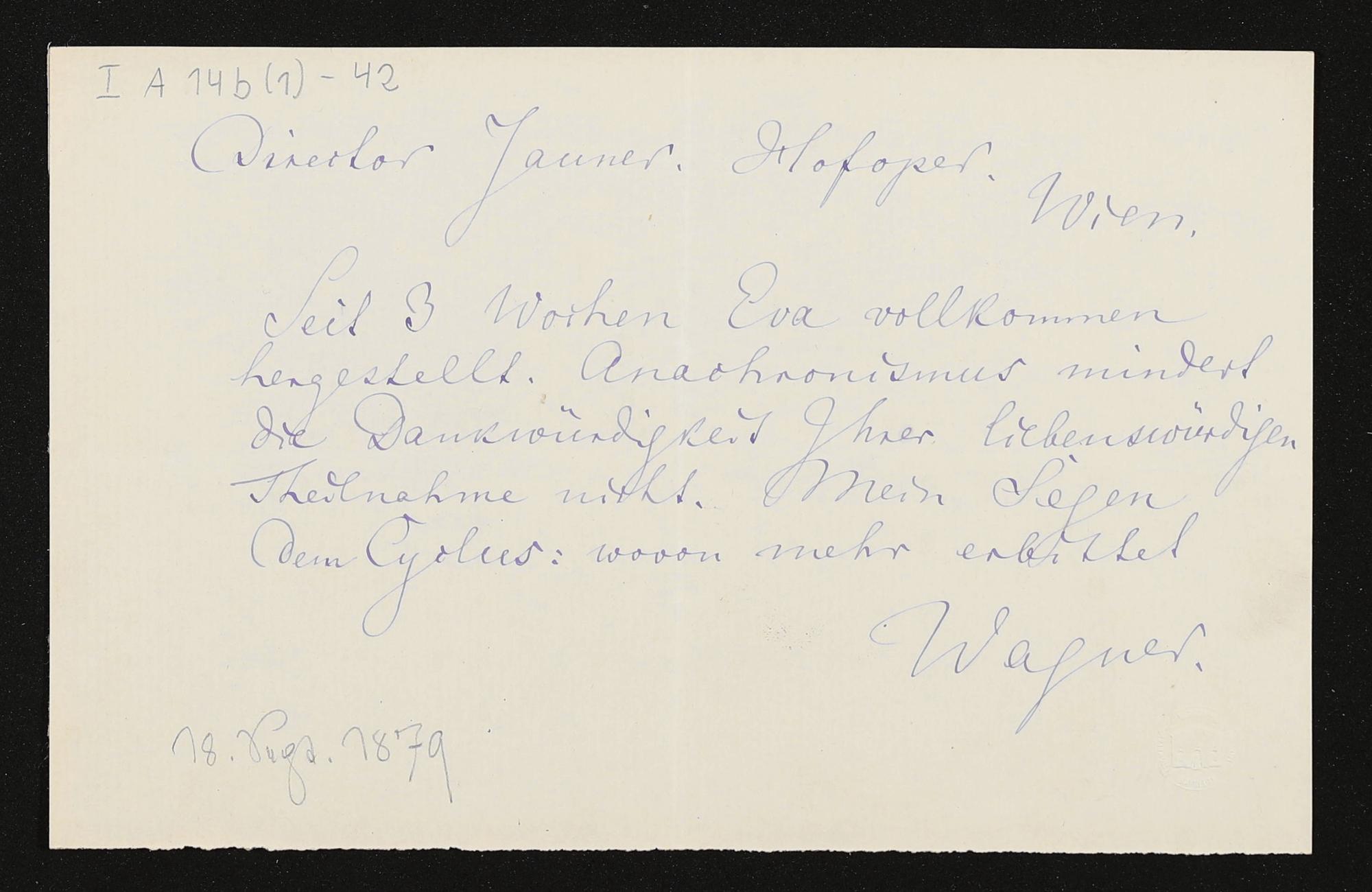 eigenhändige Briefkarte von Richard Wagner an Franz von Jauner