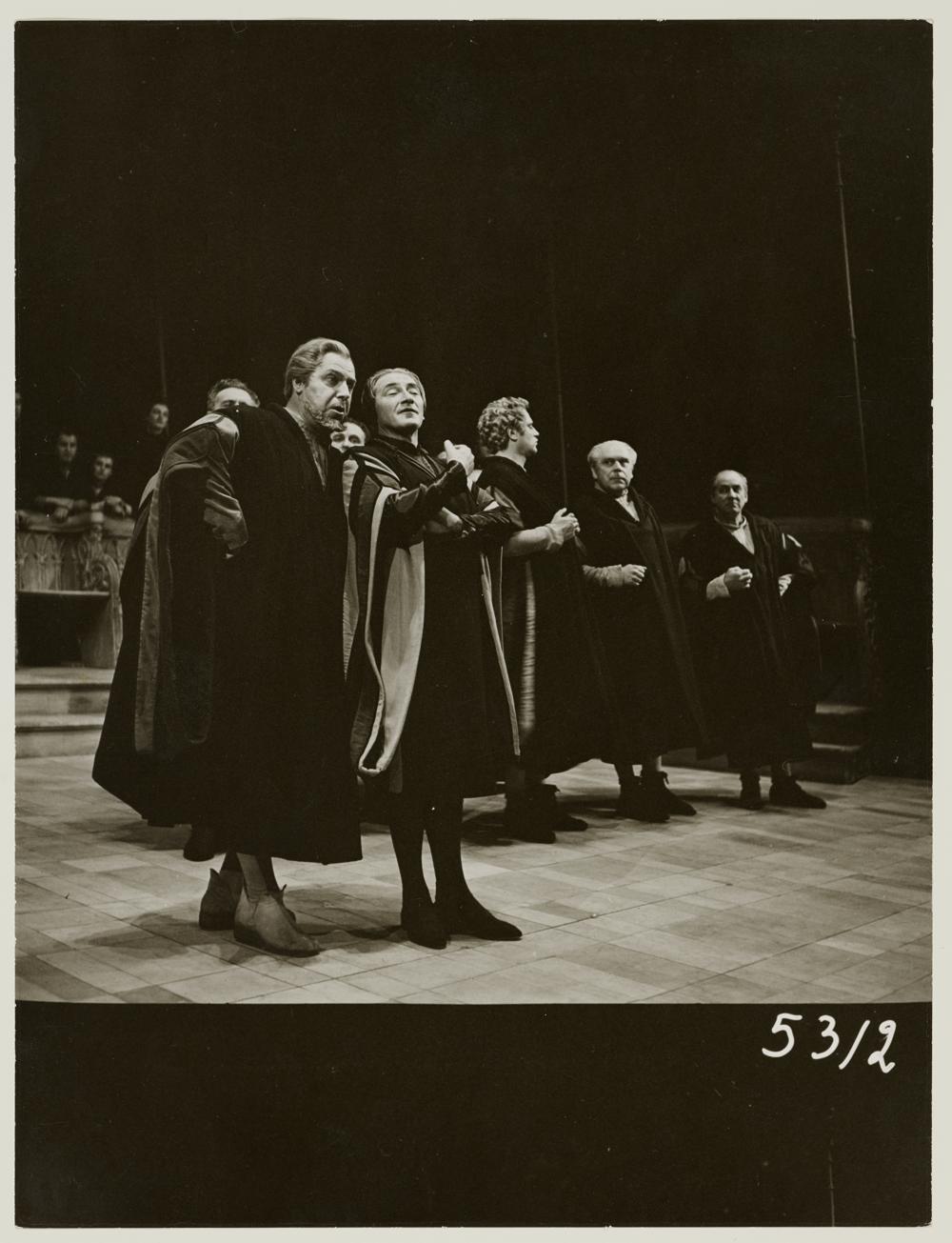 Die Meistersinger von Nürnberg, 1. Aufzug, 3. Szene, Otto Wiener als Hans Sachs, Karl Schmitt-Walter als Sixtus Beckmesser, Eberhard Waechter als Fritz Kothner und Egmont Koch als Konrad Nachtigall