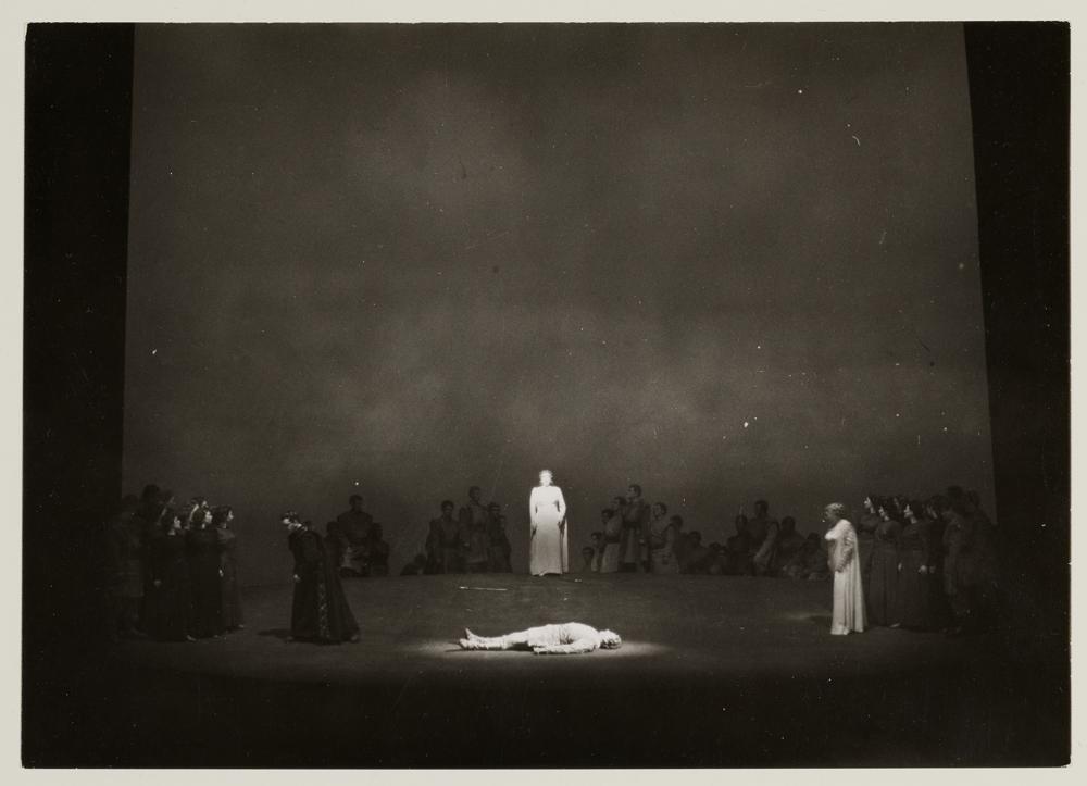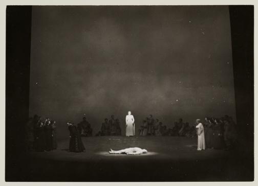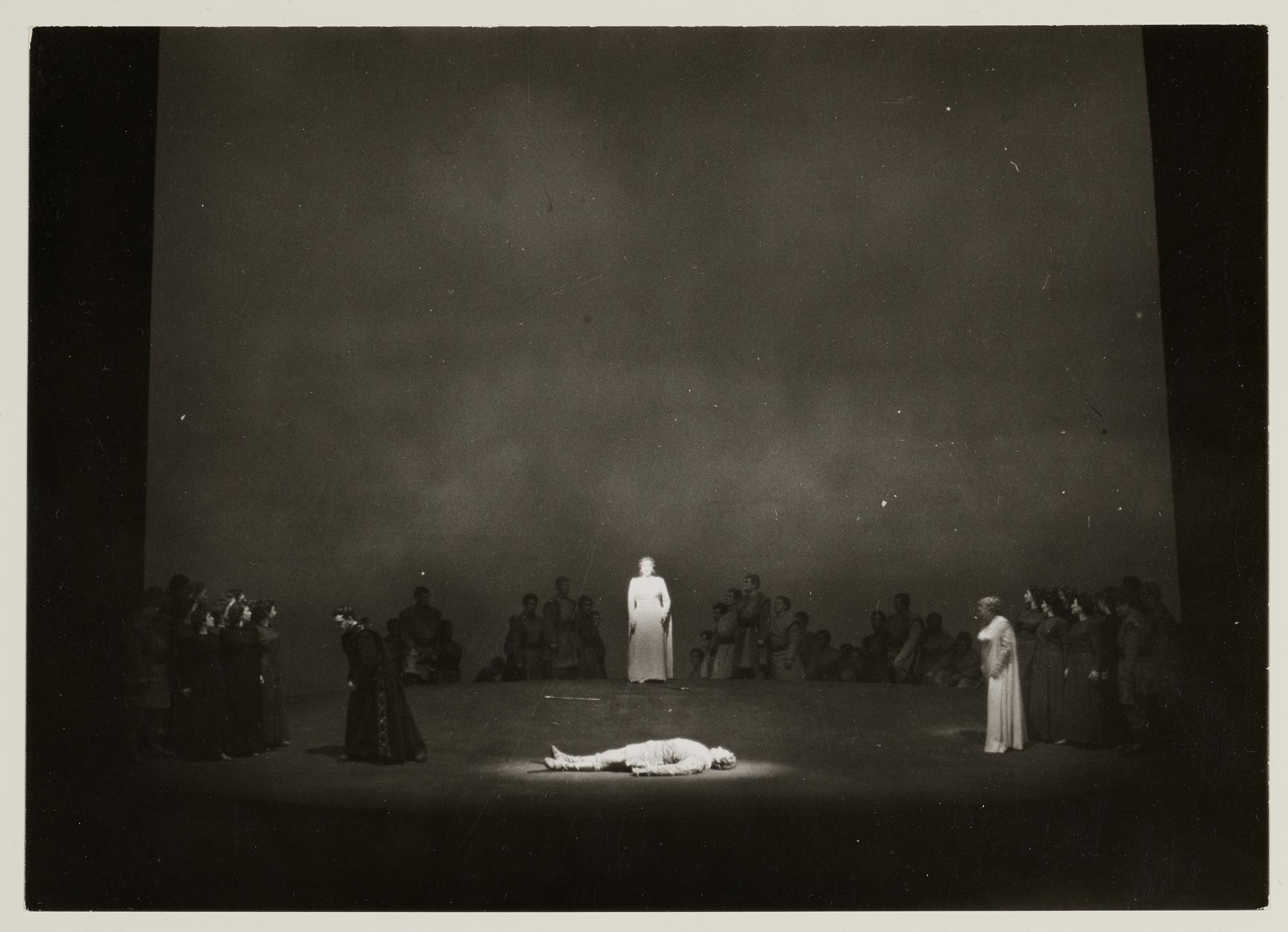 Götterdämmerung, 3. Aufzug, 3. Szene, Astrid Varnay als Brünnhilde und Wolfgang Windgassen als der tote Siegfried, im Hintergrund Josef Greindl als Hagen und die Mannen