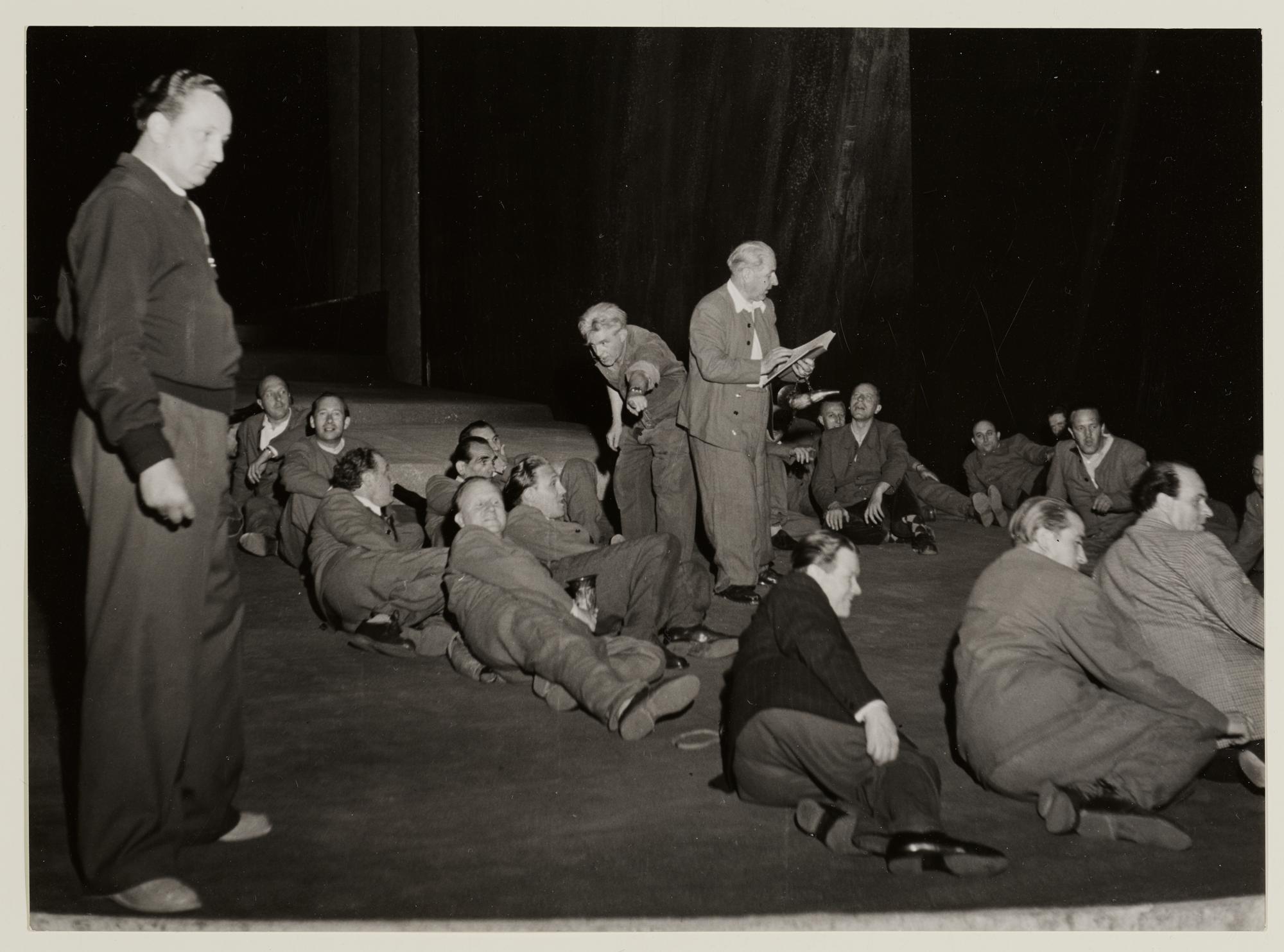 Götterdämmerung, 3. Aufzug, 2. Szene, Wolfgang Windgassen als Siegfried und Herren vom Festspielchor bei einer Probe