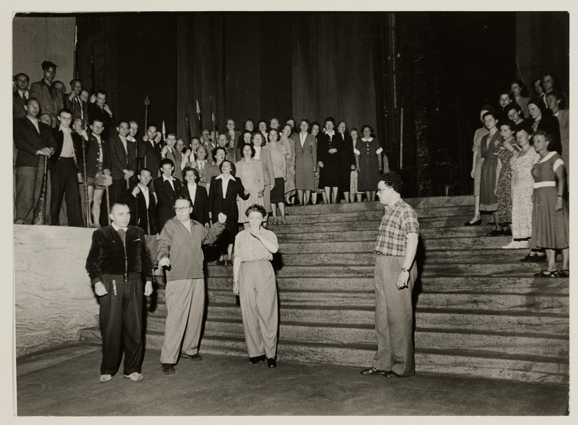 Götterdämmerung, 2. Aufzug, Bernd Aldenhoff als Siegfried, Martha Mödl als Gutrune und der Festspielchor bei einer Probe mit Wieland Wagner und Paul Hager
