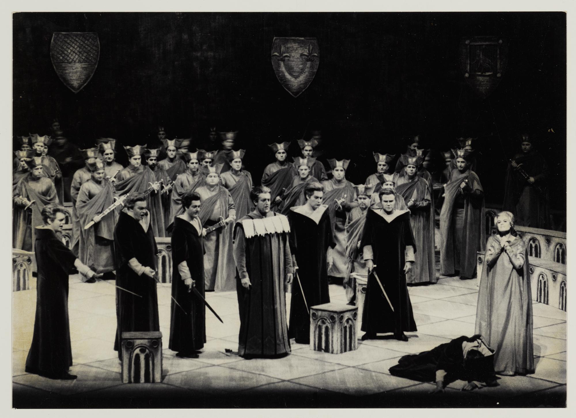 Tannhäuser, 2. Aufzug, 4. Szene, Tugomir Franc als Hermann, Landgraf von Thüringen, Jess Thomas als Tannhäuser, Anja Silja als Elisabeth, die Sänger und die Festgesellschaft