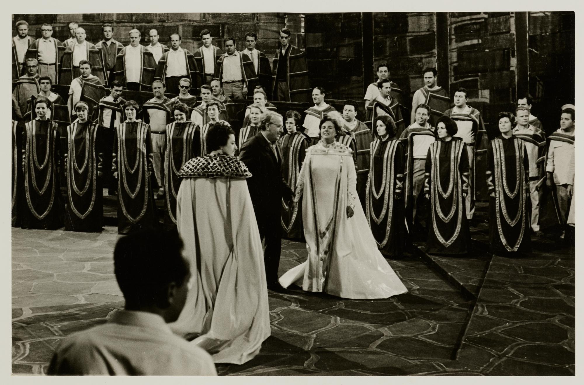 Lohengrin, 2. Aufzug, Grace Hoffman als Ortrud, Heather Harper als Elsa von Brabant und Wolfgang Wagner bei einer Probe