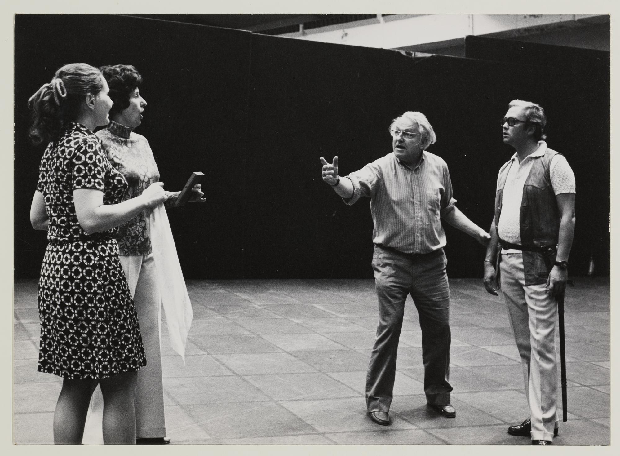 Die Meistersinger von Nürnberg, Hannelore Bode als Eva, Anna Reynolds als Magdalene, Wolfgang Wagner und René Kollo bei einer Probe