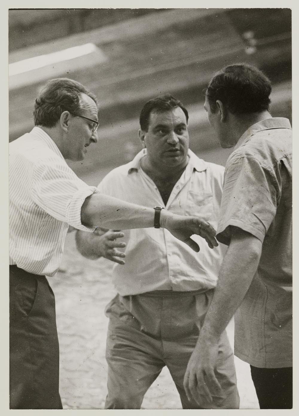Das Rheingold, 4. Bild, Wolfgang Wagner, Peter Roth-Ehrang als Fafner und David Ward als Fasolt bei einer Probe