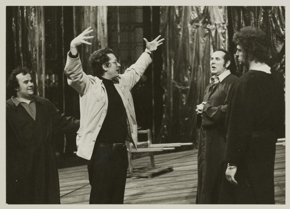 Tannhäuser, Heribert Steinbach als Heinrich der Schreiber, Götz Friedrich, Hugh Beresford als Tannhäuser und Bernd Weikl als Wolfram von Eschenbach bei einer Probe