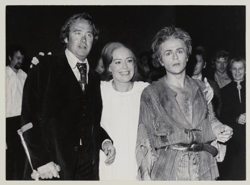 Siegfried, René Kollo als Siegfried (Gesang), Gwyneth Jones als Brünnhilde und Patrice Chéreau als Siegfried (Schauspiel) nach der Vorstellung vom 20.08.1977, 100. Vorstellung von G. Jones