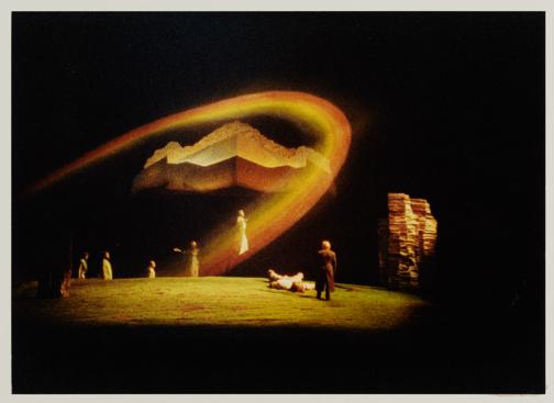 Das Rheingold, 4. Bild, Regenbogenbrücke, Johann-Werner Prein als Donner, Timothy Jenkins als Froh, Lucy Peacock als Freia, Hanna Schwarz als Fricka und Siegmund Nimsgern als Wotan