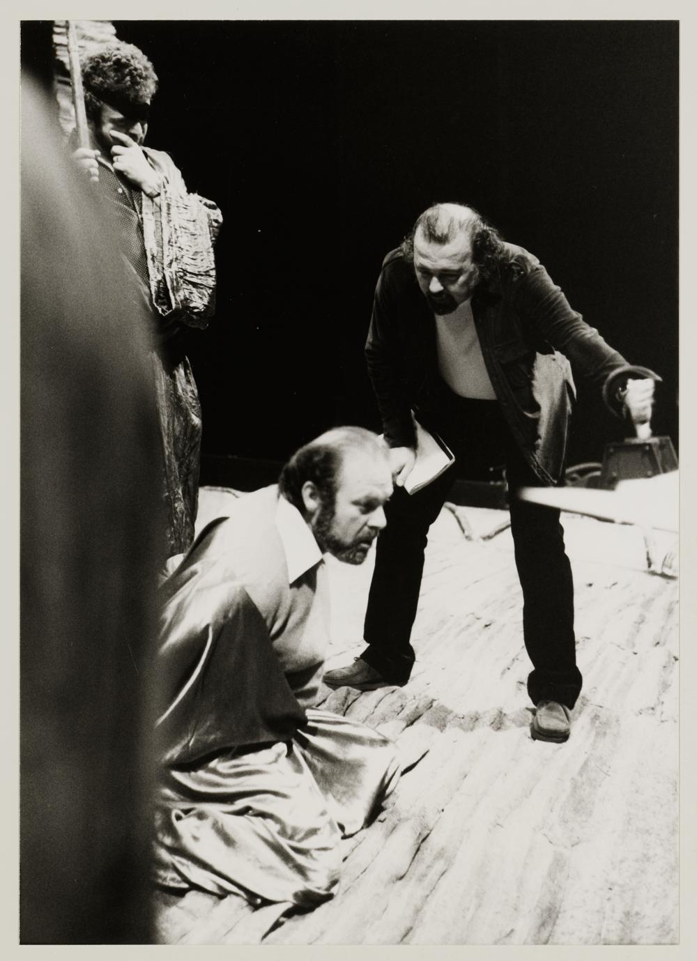 Das Rheingold, Siegmund Nimsgern als Wotan, Hermann Becht als Alberich und Peter Hall bei einer Probe