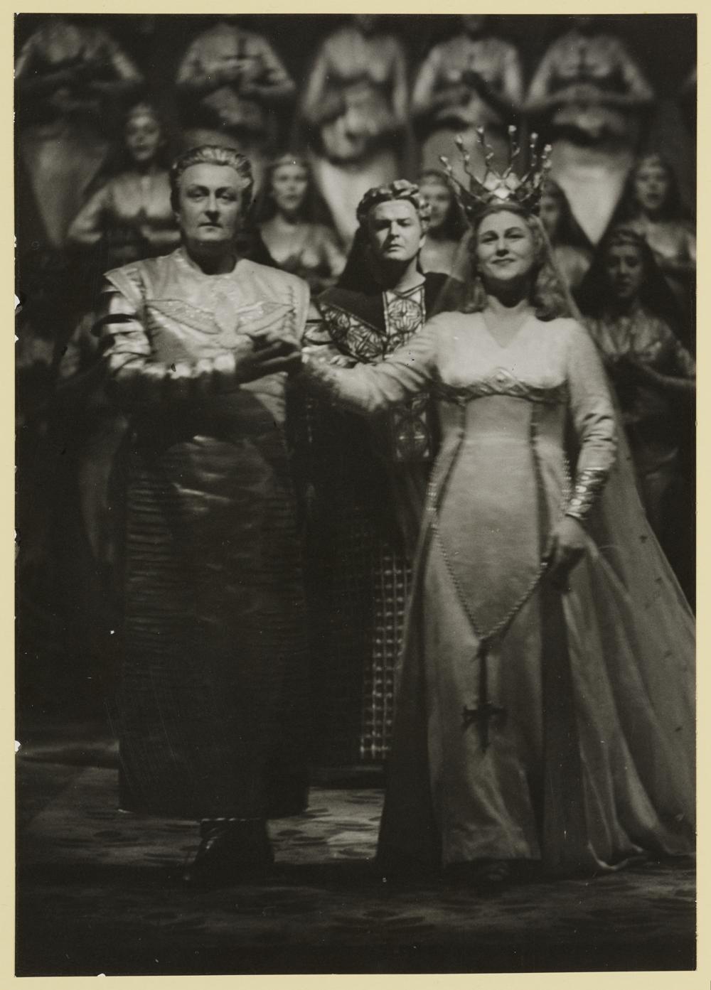 Lohengrin, 2. Aufzug, 5. Szene, Wolfgang Windgassen als Lohengrin und Aase Nordmo-Loevberg als Elsa von Brabant, dahinter Theo Adam als Heinrich der Vogler