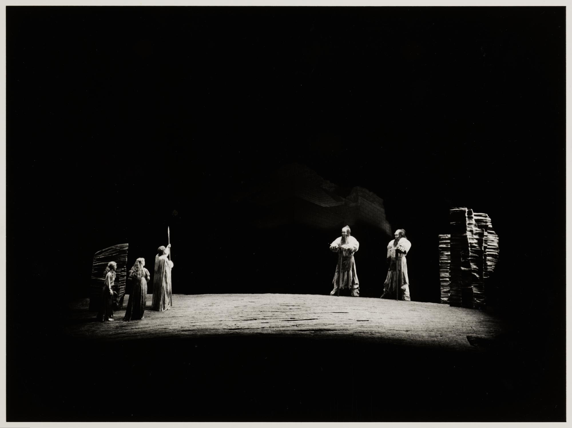 Das Rheingold, 2. Bild, Lucy Peacock als Fria, Hanna Schwarz als Fricka, Siegmund NImsgern als Wotan, Hans Tschammer als Fasolt und Dieter Schweikart als Fafner