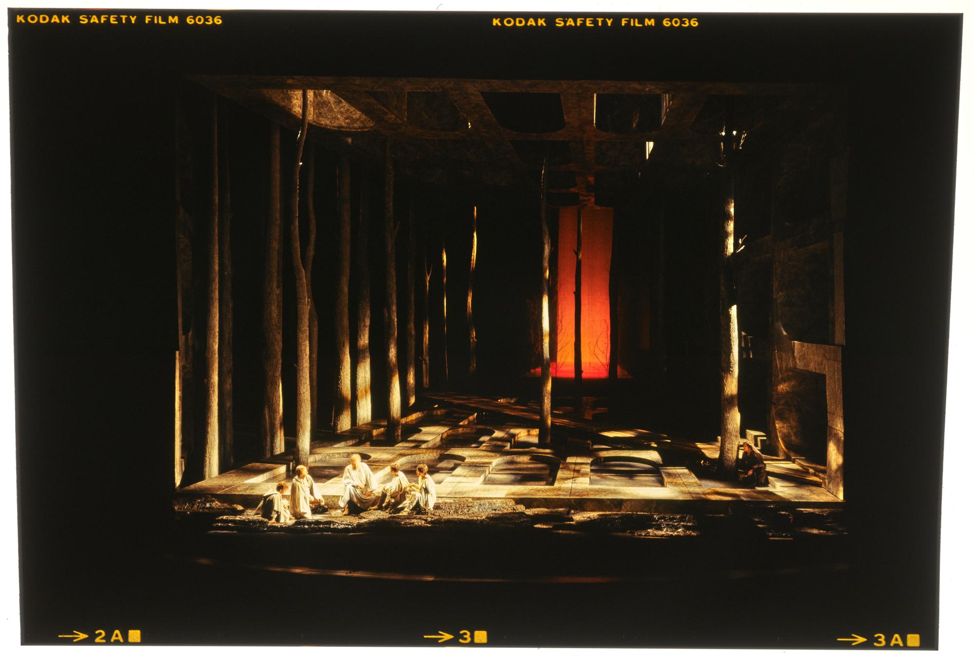 Parsifal, 1. Aufzug, Helmut Pampuch als 3. Knappe, Peter Maus als 4. Knappe, Hans Sotin als Gurnemanz, Ruthild Engert-Ely als 1. Knappe und Sabine Fues als 2. Knappe